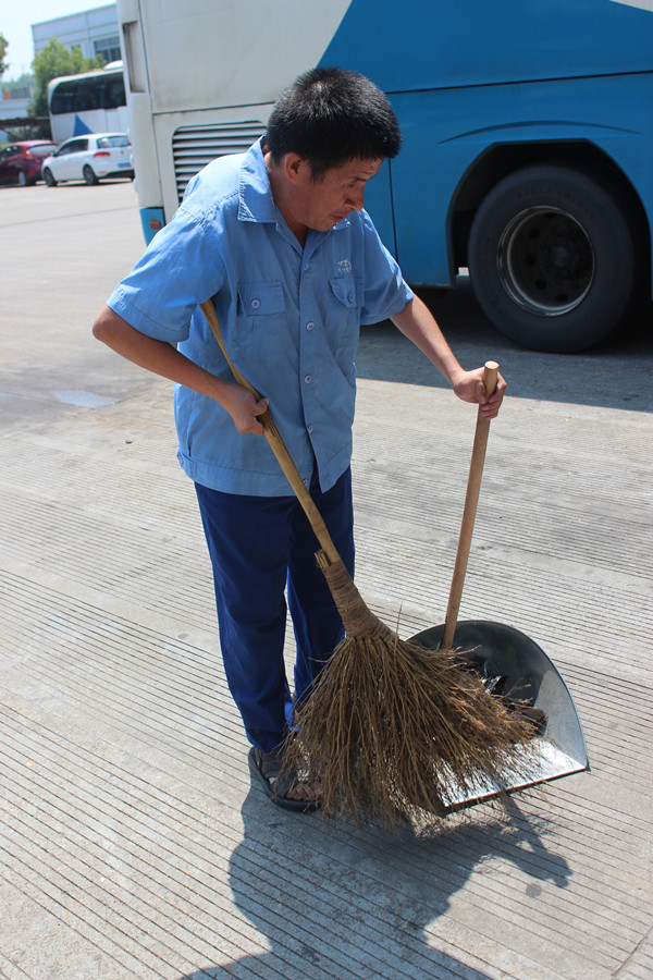 “中午時間這么熱,受得了嗎?” 他笑笑回答道:“熱是熱,既然來上班,工作總是要認(rèn)真的做好。” 站場發(fā)車區(qū)以及通道衛(wèi)生都是宓建文今天當(dāng)班的清掃范圍,他頂著烈日掃上一圈至少要半個小時,每次掃完在下客區(qū)稍坐片刻,喝上一口水,又提著簸箕和掃把開始新一輪的清掃。他說:“要是時間間隔再長些,垃圾就會多,特別是發(fā)車區(qū)前是旅客檢票上車的必經(jīng)之路,不清掃勤些,有損車站整潔衛(wèi)生的形象?!?br/> 11:30時,火紅的太陽炙烤大地,加之客車散發(fā)的熱浪撲面而來,行包裝卸工冒著熱浪辛勤作業(yè),準(zhǔn)時地收發(fā)一批批貨物;門檢人員頭頂烈日,認(rèn)真的對每一輛出站客車按規(guī)定進行安全檢查;保衛(wèi)稽查人員頭頂著驕陽執(zhí)勤,保障了旅客候車環(huán)境安全有序……分散在不同崗位的一線客運職工揮汗如雨,他們都在為更好的服務(wù)旅客而辛勤勞動著。