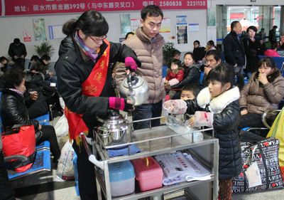 2月8日冷空氣來襲,雨夾雪,一大早西站“流動之家”服務(wù)班的姐們就準(zhǔn)備好一大壺?zé)釟怛v騰的姜茶,并將一杯杯熱氣騰騰的姜茶送給返鄉(xiāng)旅客,在幫助他們抵御嚴(yán)寒的同時使他們從內(nèi)心感受到“家”的溫暖與關(guān)愛。