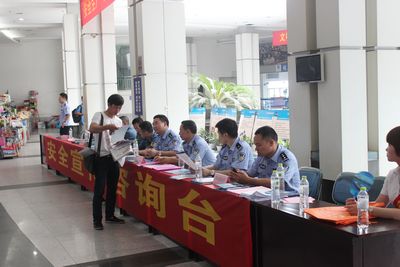活動(dòng)現(xiàn)場(chǎng)懸掛了安全生產(chǎn)宣傳標(biāo)語,設(shè)置了安全咨詢臺(tái),并在候車室前廳、中廳等人員聚集的位置,放置了各類以安全為主題的宣傳版畫,圖文并茂的向旅客宣傳了防詐騙、交通、防恐等安全知識(shí)。在整個(gè)活動(dòng)期間,到咨詢臺(tái)來現(xiàn)場(chǎng)咨詢的旅客絡(luò)繹不絕,各單位咨詢?nèi)藛T還向旅客發(fā)放了《平安交通 人人有責(zé)》、《警民相約 共建和諧》、《公民防范恐怖襲擊手冊(cè)》、《為防范與遏制“電信(網(wǎng)絡(luò))詐騙犯罪”致市民的一封信》等十余種安全生產(chǎn)宣傳資料共計(jì)2000余份,營(yíng)造了安全生產(chǎn)月活動(dòng)的良好氛圍。