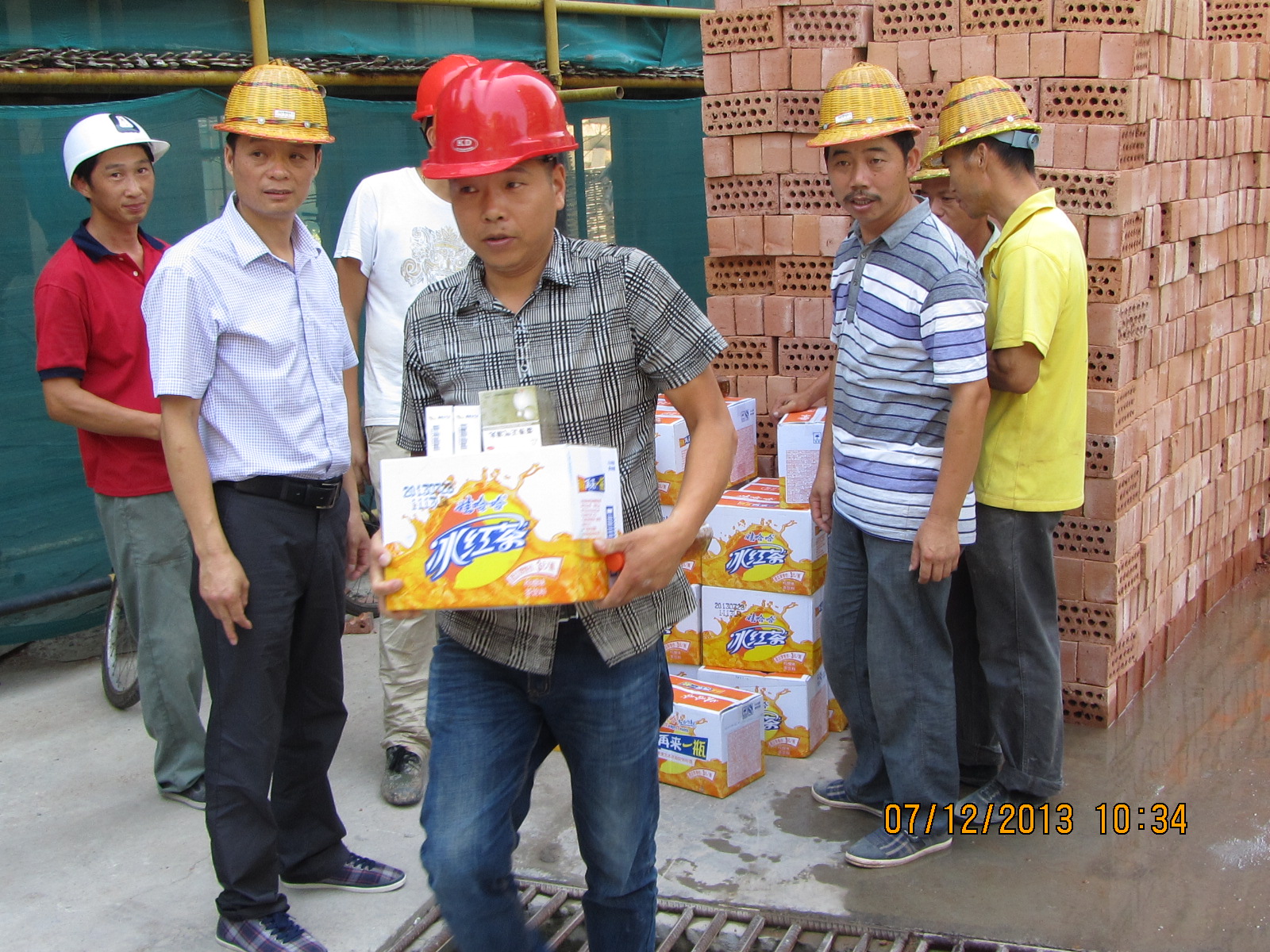 當(dāng)前,夏日炎炎,驕陽似火,正值建筑施工生產(chǎn)旺季,金龍.長運花苑工地的工人師傅們頂著高溫酷暑辛勤地工作。2013年7月12日,南明房地產(chǎn)公司工程部在公司副總經(jīng)理的帶領(lǐng)下,帶著清涼食品和防暑保健藥品到施工現(xiàn)場積極開展“夏日送清涼”活動,給奮戰(zhàn)在一線的建筑工人送去項目部的關(guān)懷和慰問。并叮囑大家在高溫作業(yè)時,要合理安排作息時間,做好防暑降溫工作,并要求項目部做好食堂的飲食和疾病防疫等工作,在施工現(xiàn)場按照公司規(guī)定配備安全生產(chǎn)和職業(yè)防護(hù)設(shè)施,加大對工人的防暑降溫和中暑急救知識的宣傳教育,確保工人的身體健康和安全施工。
