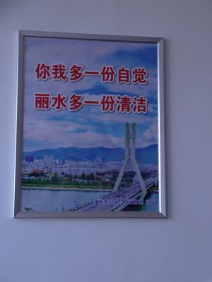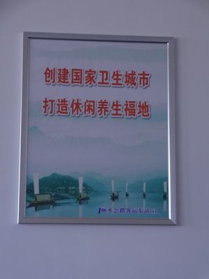 現(xiàn)在,墻上懸掛的是創(chuàng)衛(wèi)口號與麗水山水風光相結合的宣傳畫,賞心悅目。