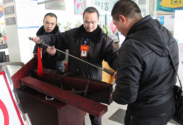 西站安檢崗位潘峰、金翔、鐘韶華值班三位同志在值班。今天客流量大,是平時(shí)的一倍左右,安檢員們工作也都比往常更認(rèn)真仔細(xì)了。80:50分左右,鐘韶華、金翔發(fā)現(xiàn)一名男子提著三盒包裝精美的禮盒經(jīng)過(guò)安檢。鐘韶華忙禮貌上前將該男子叫到一邊,讓他開(kāi)包檢查。經(jīng)檢查,三盒均為龍泉寶劍,其中兩把寶劍未開(kāi)封可攜帶,一把寶劍已開(kāi)封不能攜帶上車(chē),按規(guī)定對(duì)這把寶劍進(jìn)行了登記暫扣處理。該男子也很配合安檢員的工作,直夸安檢員們工作認(rèn)真細(xì)致。
