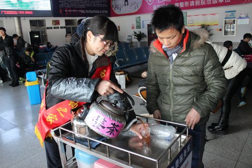 昨天進入到大寒節(jié)氣,今天馬上就有一股冷空氣來應(yīng)景,氣溫有小幅的下降。一大早西站“流動之家”服務(wù)班的姐們就準備好一大壺熱氣騰騰的姜茶,免費為候車大廳的旅客送上熱姜茶,幫助他們驅(qū)去寒意,溫暖回家的旅程。