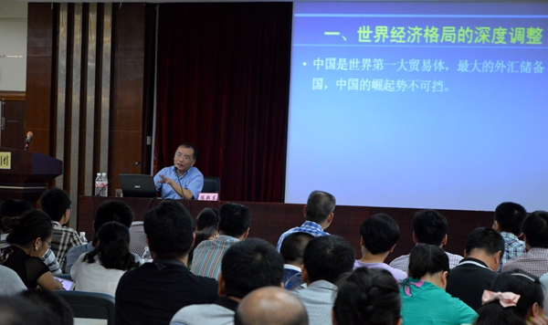 在上課過程中,陳敬東教授圍繞世界經(jīng)濟(jì)格局的深度調(diào)整、中國(guó)經(jīng)濟(jì)的換檔期和陣痛期、大膽創(chuàng)新落實(shí)改革意圖、中國(guó)經(jīng)濟(jì)的發(fā)展趨勢(shì)分析及新形勢(shì)下企業(yè)如何應(yīng)對(duì)挑戰(zhàn)等五個(gè)方面對(duì)當(dāng)前宏觀經(jīng)濟(jì)形勢(shì)進(jìn)行了分析講解。在企業(yè)如何應(yīng)挑戰(zhàn)中,陳教授指出:在當(dāng)前形勢(shì)下,企業(yè)應(yīng)從培育新的意識(shí)、找準(zhǔn)新的定位、制定新的戰(zhàn)略、開發(fā)新的產(chǎn)品和服務(wù)、建立新的品牌等方面進(jìn)行努力,迎接新一輪挑戰(zhàn)。