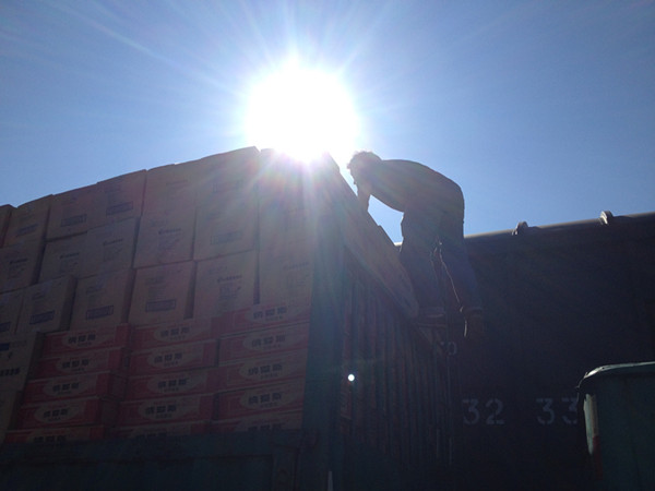 7月29日14:05,南明物流貨運(yùn)駕駛員高麗平在烈日下忙碌地裝卸貨物