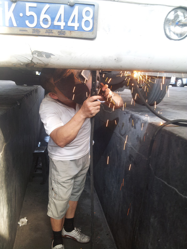 客長運(yùn)分公司修理工陳勇軍師傅正在進(jìn)行電焊作業(yè),灼眼的火星、淺藍(lán)的焊霧、嗆鼻的氣味彌漫維修車間