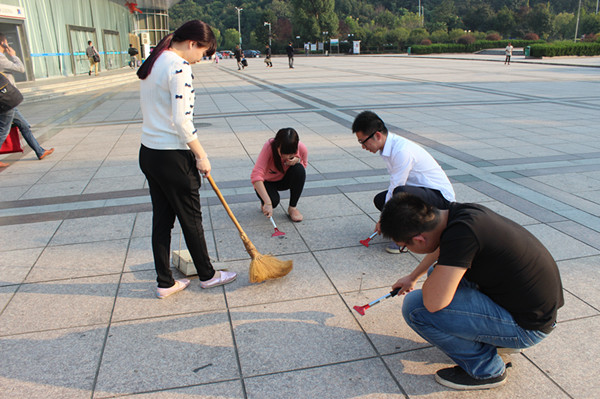 鏟刀、清潔刷、掃把、水管……清潔工具一一分配到手中之后,大家便熱火朝天的干起來(lái)。雖已入秋,但午后的太陽(yáng)依然刺眼,沒(méi)一會(huì)兒,大家都開始冒汗,但誰(shuí)也沒(méi)停下手中的勞動(dòng),依舊頂著太陽(yáng)蹲在地上鏟口香糖或是奮力地洗刷地面。