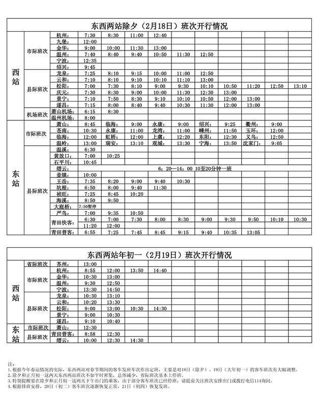 根據(jù)今年春運(yùn)實(shí)際的情況,東、西兩站對(duì)春節(jié)期間的客運(yùn)班車(chē)作出調(diào)整。2月18日(除夕)、19日(大年初一)的客運(yùn)班次變動(dòng)較大,密集減少,省際班次基本上停班。特別提醒要在除夕和正月初一這兩天下午出門(mén)的乘客,由于部分客車(chē)班次已經(jīng)停班,請(qǐng)?zhí)崆瓣P(guān)注班次安排,或撥打電信114詢(xún)問(wèn) ,盡量提前購(gòu)票以免耽誤您的行程。從2月20日(初二)起客車(chē)班次逐漸恢復(fù),2月22日(初四)起全部恢復(fù)正常發(fā)班。