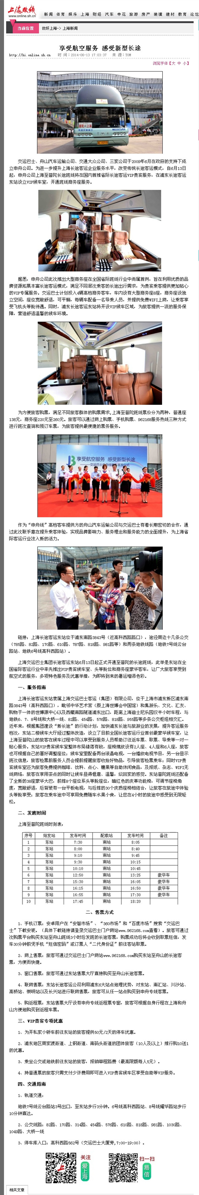 2014年6月13日起,國(guó)內(nèi)交運(yùn)巴士上海至普陀的申舟長(zhǎng)途班線,在國(guó)內(nèi)首推長(zhǎng)途客運(yùn)VIP貴賓服務(wù),在浦東客運(yùn)東站設(shè)立VIP候車室,開(kāi)通類似于飛機(jī)頭等艙的班線商務(wù)座服務(wù),以滿足不同層次乘客的長(zhǎng)途出行需求。據(jù)了解,交運(yùn)巴士投入4輛高檔商務(wù)客車,車內(nèi)設(shè)有大型商務(wù)座8座,商務(wù)座設(shè)獨(dú)立空間,座位寬敞舒適且可平躺,后背裝有平板電視,每輛車配備一名導(dǎo)乘人員,并提供免費(fèi)WIFI上網(wǎng)。同時(shí),浦東客運(yùn)東站也設(shè)置了目前全國(guó)長(zhǎng)途客運(yùn)行業(yè)最豪華的VIP候車區(qū)域,讓旅客在候車過(guò)程中享受到服務(wù)人員幫助訂往返車票、取票、導(dǎo)乘等一對(duì)一的貼心服務(wù)。同時(shí)在細(xì)節(jié)上也極為細(xì)致,例如為開(kāi)私家小轎車前往東站的旅客提供50元/2天的停車優(yōu)惠、浦東地區(qū)周家渡街道、上鋼街道、南碼頭街道的團(tuán)體旅客(10人及以上)推行購(gòu)10送1的優(yōu)惠等。