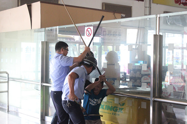 首先進(jìn)行科目一:通訊聯(lián)絡(luò)演練 候車廳發(fā)現(xiàn)可疑人員,經(jīng)理室用對(duì)講話機(jī)發(fā)出“經(jīng)理室通知,各崗位加強(qiáng)安?!毙畔?,各崗位收到后回復(fù)“XX崗位已收到”,以檢驗(yàn)各崗位對(duì)講機(jī)使用的熟練程度和規(guī)范性。 隨后進(jìn)行科目二:突發(fā)性事件應(yīng)急處置演練 行車員發(fā)現(xiàn)普客候車廳內(nèi)有一名醉酒男子情緒激動(dòng)揮舞木棍,危及旅客安全,立即跑向調(diào)度室向業(yè)務(wù)站值班站長報(bào)告,值班站長接到報(bào)告后通過對(duì)講機(jī)向其它崗位呼叫。并立即組織本部門值班人員趕到現(xiàn)場將旅客疏散到安全的區(qū)域;保衛(wèi)科接到報(bào)告后立即做出回應(yīng),啟動(dòng)反恐防范應(yīng)急預(yù)案,攜帶反恐防范器具前往現(xiàn)場控制住施暴者;同時(shí)由2名保衛(wèi)人員組成警戒協(xié)調(diào)組也到達(dá)現(xiàn)場負(fù)責(zé)外圍的警戒工作。