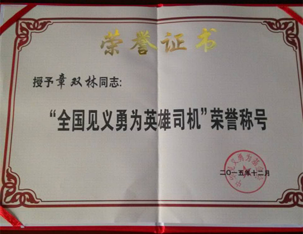章雙林在獲得“全國見義勇為英雄司機(jī)”的同時,還同時入圍了中華保險“中國好司機(jī)”,也于今日在北京接受表彰。