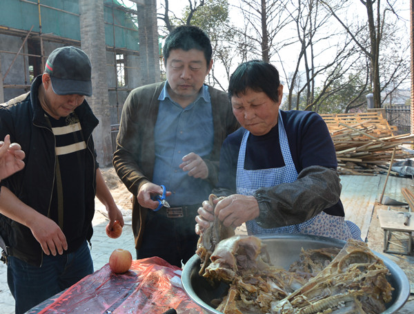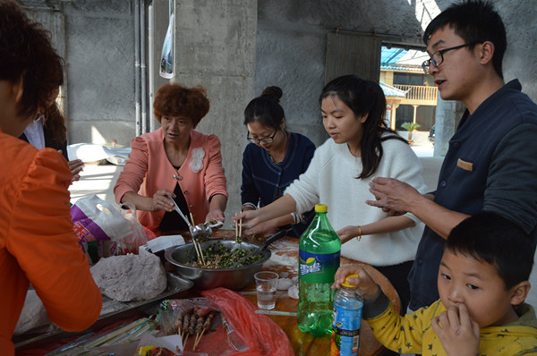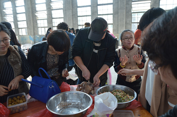 這邊包餃子的問(wèn)題正討論的激烈,那邊熱氣騰騰的豬頭也出鍋了?!把剑@么大的豬頭,小時(shí)候過(guò)年的感覺(jué)”?!皩?duì)啊,對(duì)啊,這種氣氛,這種味道,太有紀(jì)念意義了”?!皝?lái)來(lái)來(lái),我拍張照片,微信朋友圈曬一曬”。黃色餃子、綠色餃子、紅色餃子、紫色餃子相繼的出鍋了,燒烤的食品也相繼出爐,大家互相品評(píng),因?yàn)槎际亲约簞?dòng)手參與,一切都變成了美食。