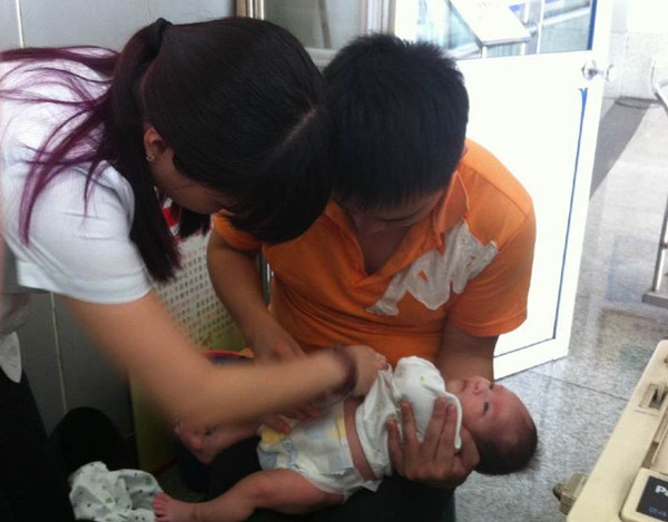 恰在這時,一名年輕的“奶爸”旅客左手拉著一個行李箱,背后背著一個大包,右手還抱著一個尚在襁褓中嚶嚶哭泣的小嬰兒,滿頭大汗的來到服務(wù)臺前,小寶寶可能肚子餓了,一直在哭泣,小寶寶的媽媽又沒有隨行,只有爸爸一個人對付小家伙,實(shí)在是沒轍了,只得到服務(wù)臺求助。