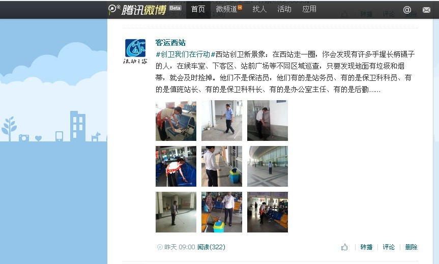 根據(jù)麗水市創(chuàng)建國家衛(wèi)生城市工作領(lǐng)導(dǎo)小組辦公室《關(guān)于利用微博做好創(chuàng)衛(wèi)宣傳工作的通知》,麗水客運(yùn)西站積極響應(yīng),并與8月21日在客運(yùn)西站騰訊微博賬戶開通“創(chuàng)衛(wèi)我們在行動”專欄和“健康知識”專欄。