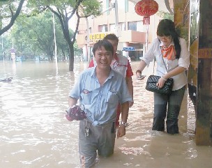 洪水突襲市區(qū)后,售后接待電話就接連不斷,傳來的都是客戶急切救援的聲音。為更快速的開展救援工作,20日下午,夏偉強經(jīng)理親自帶領(lǐng)施救組在一線實地指揮搶險救災;經(jīng)理助理金虹則帶領(lǐng)銷售團隊分組分頭沿著水路挨家挨戶上門咨詢、了解車輛受災情況,以便施救車輛更快的實施施救工作;經(jīng)理助理呂佩軍在現(xiàn)場與售后師傅們現(xiàn)場轉(zhuǎn)移車輛,推、拉、移所有的招式都用上了。渾濁的污水都沒過了大腿,他們都無所畏忌。