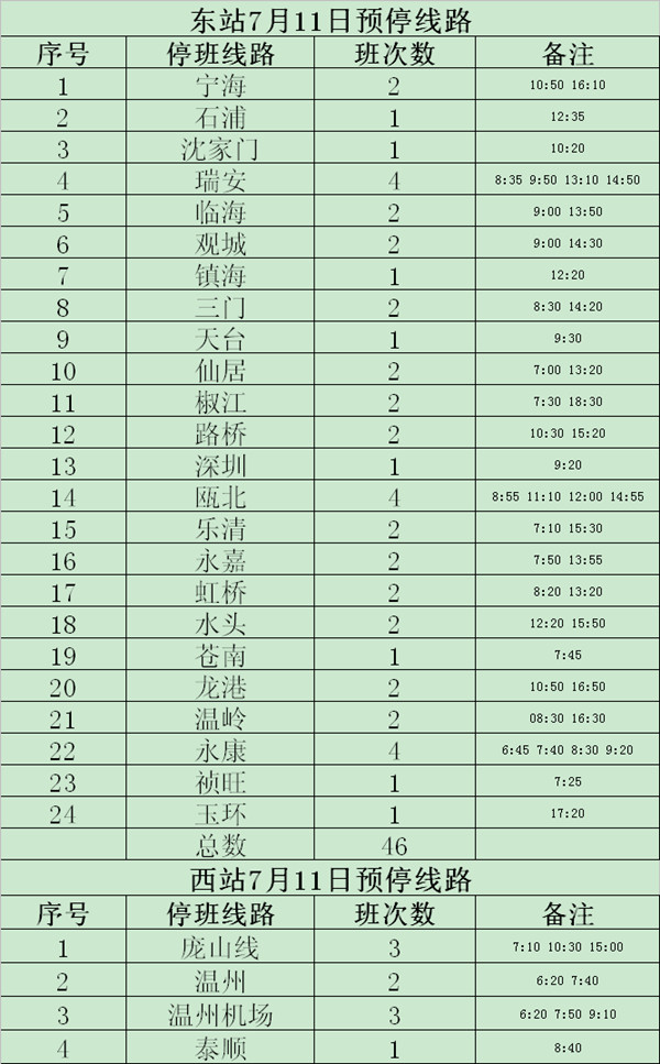 因臺風(fēng)“燦鴻”影響,為確保乘客安全,麗汽集團(tuán)客運(yùn)東、西兩站暫時停開下列班車,具體復(fù)班時間視11日臺風(fēng)情況再行公告。